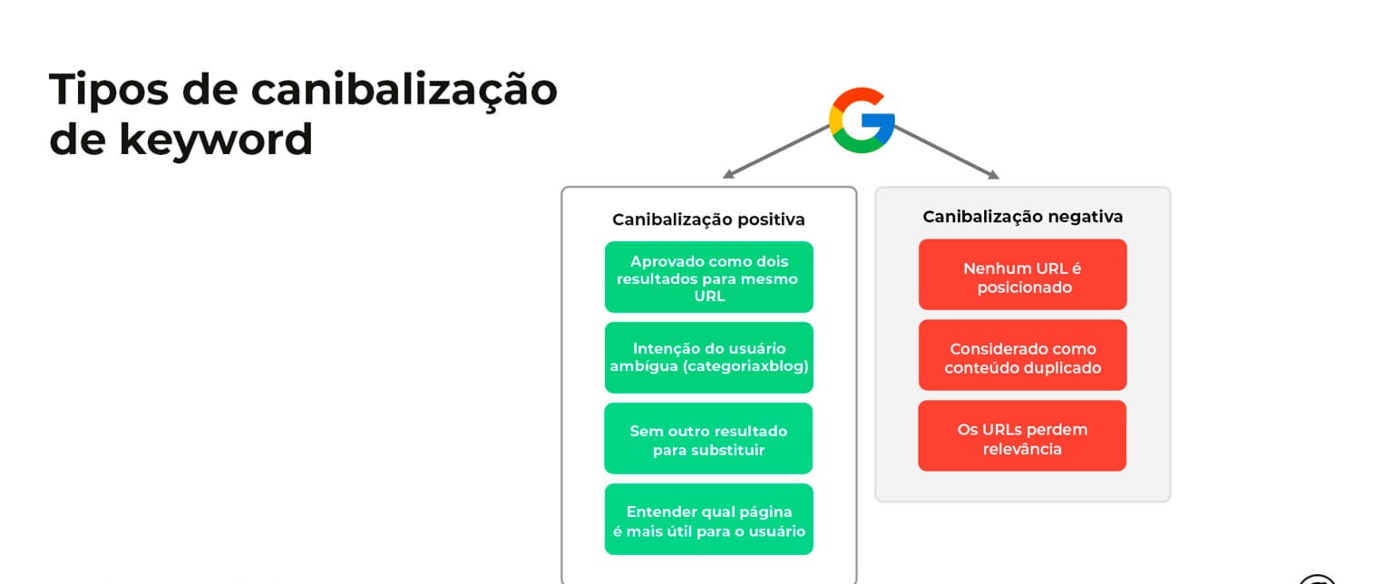 O Google utiliza a intenção de busca como principal fator. A Canibalização ocorre quando várias páginas abordam o mesmo tópico primário visando a mesma intenção (ex: duas páginas de blog tentando definir o mesmo termo “SEO”).