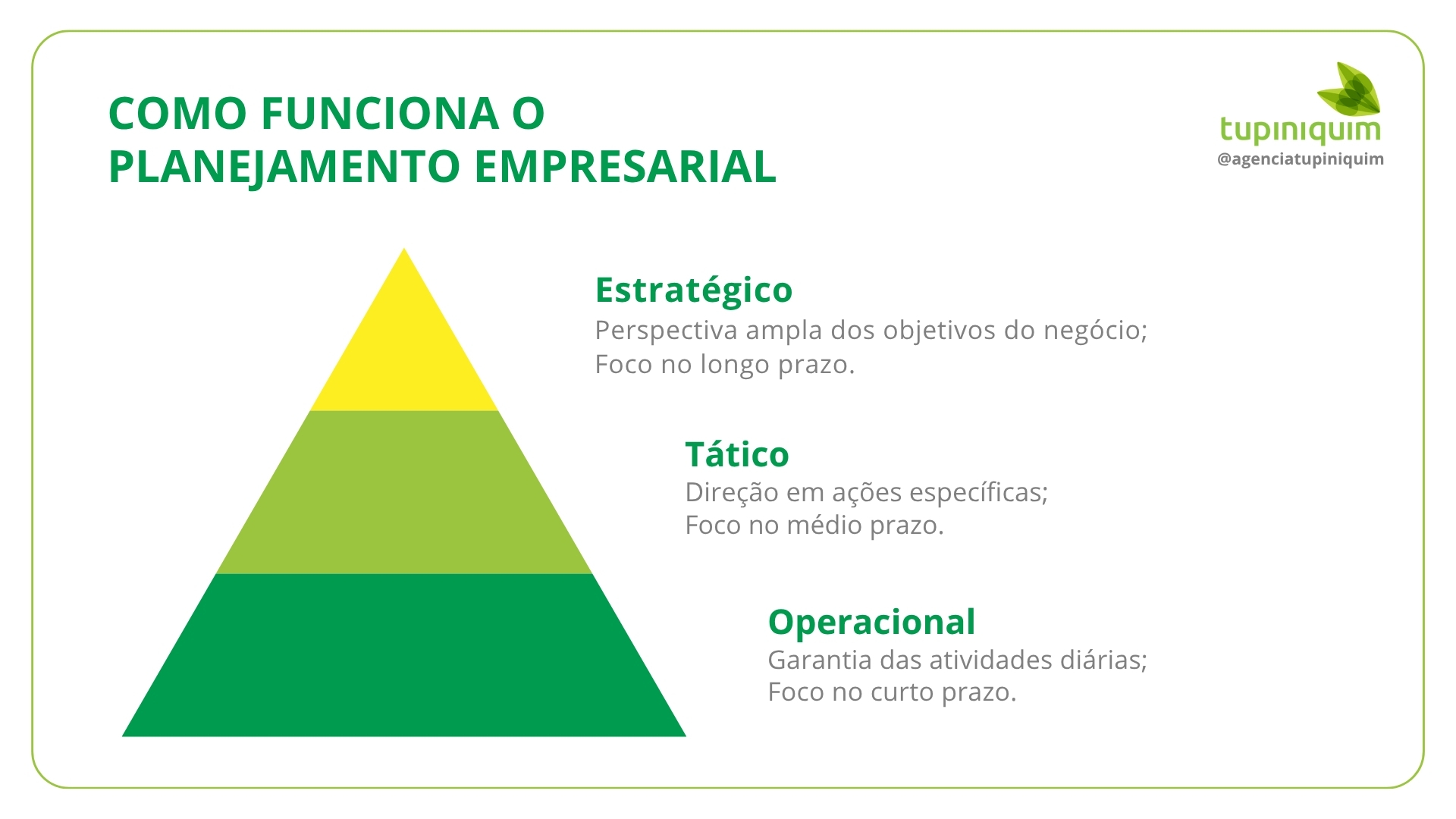 Dentro da gestão corporativa, o planejamento pode ser classificado em diferentes níveis, cada um com um papel específico no crescimento sustentável da organização. Conhecer esses tipos ajuda a estruturar um plano completo, que vai do direcionamento estratégico de longo prazo até a execução operacional do dia a dia.